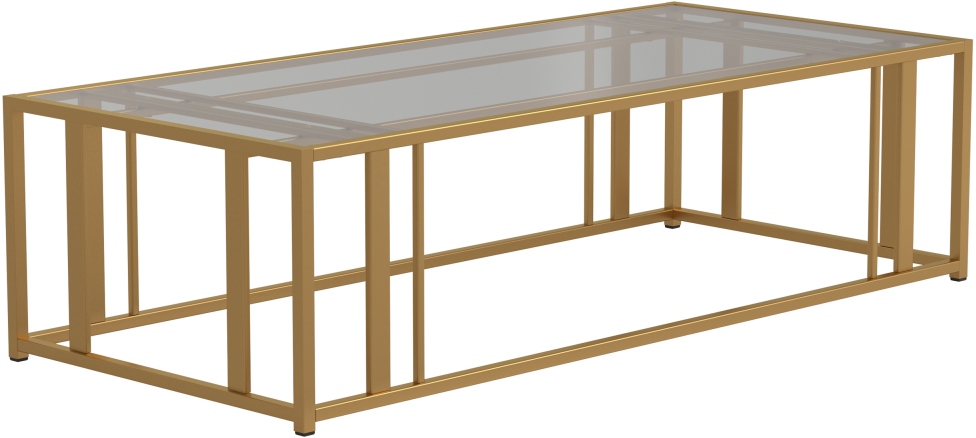 Create a well-styled living room that brims with modern appeal. This contemporary coffee table flaunts a unique design that stands out in any space. The base is beautifully crafted with crisp, clean lines of electroplated metal. A magnificent, matte brass finish adds an edge of elegant allure. The rectangular tabletop is made of clear tempered glass for exceptional quality and style.
