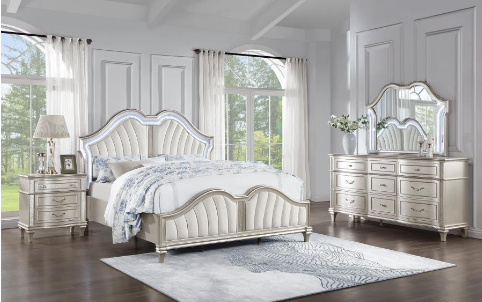Complete your primary suite with this stunning, glam bedroom set, featuring a lovely platform bed, nightstand, dresser, and mirror combo in a gorgeous silver oak finish with glittering accent panels. The platform boasts a beautiful double arch headboard and matching footboard, designed with a channel tufted.Read More